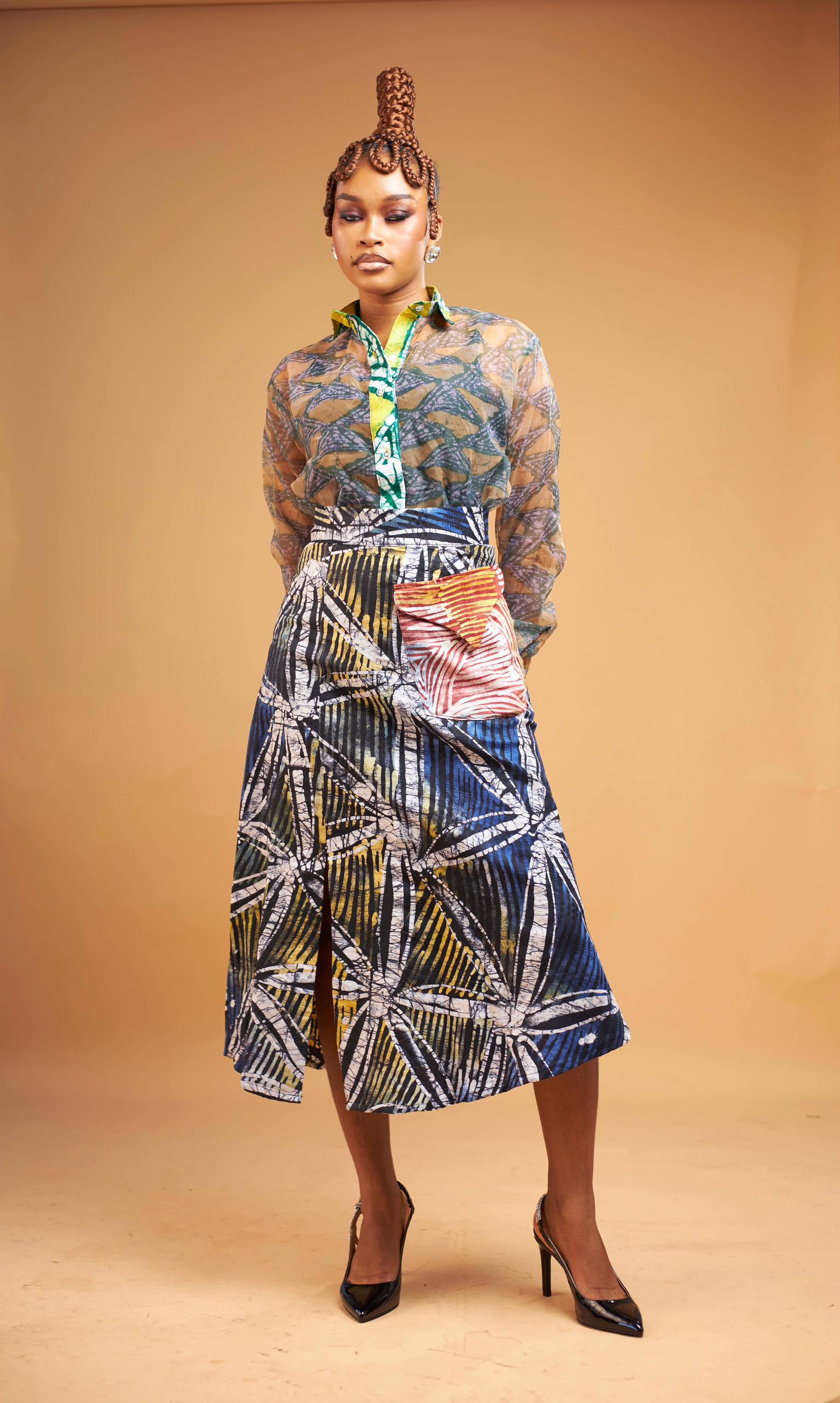 Soft meets striking. The Omalicha Set pairs a sheer organza button down shirt with a vibrant mixed Adire skirt — a poetic blend of texture and color. It’s made for the woman who radiates confidence and beauty that runs deeper than appearance.
