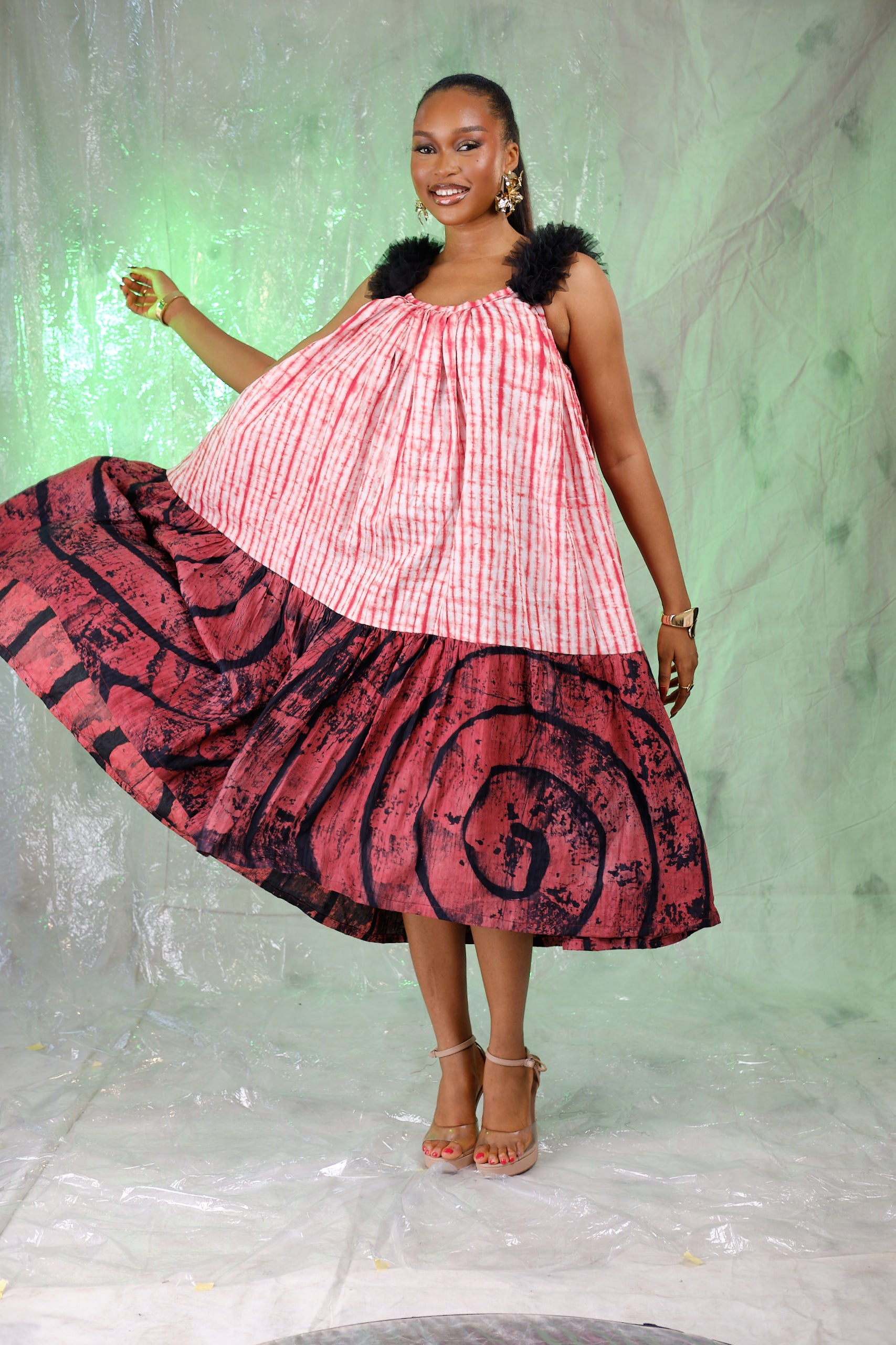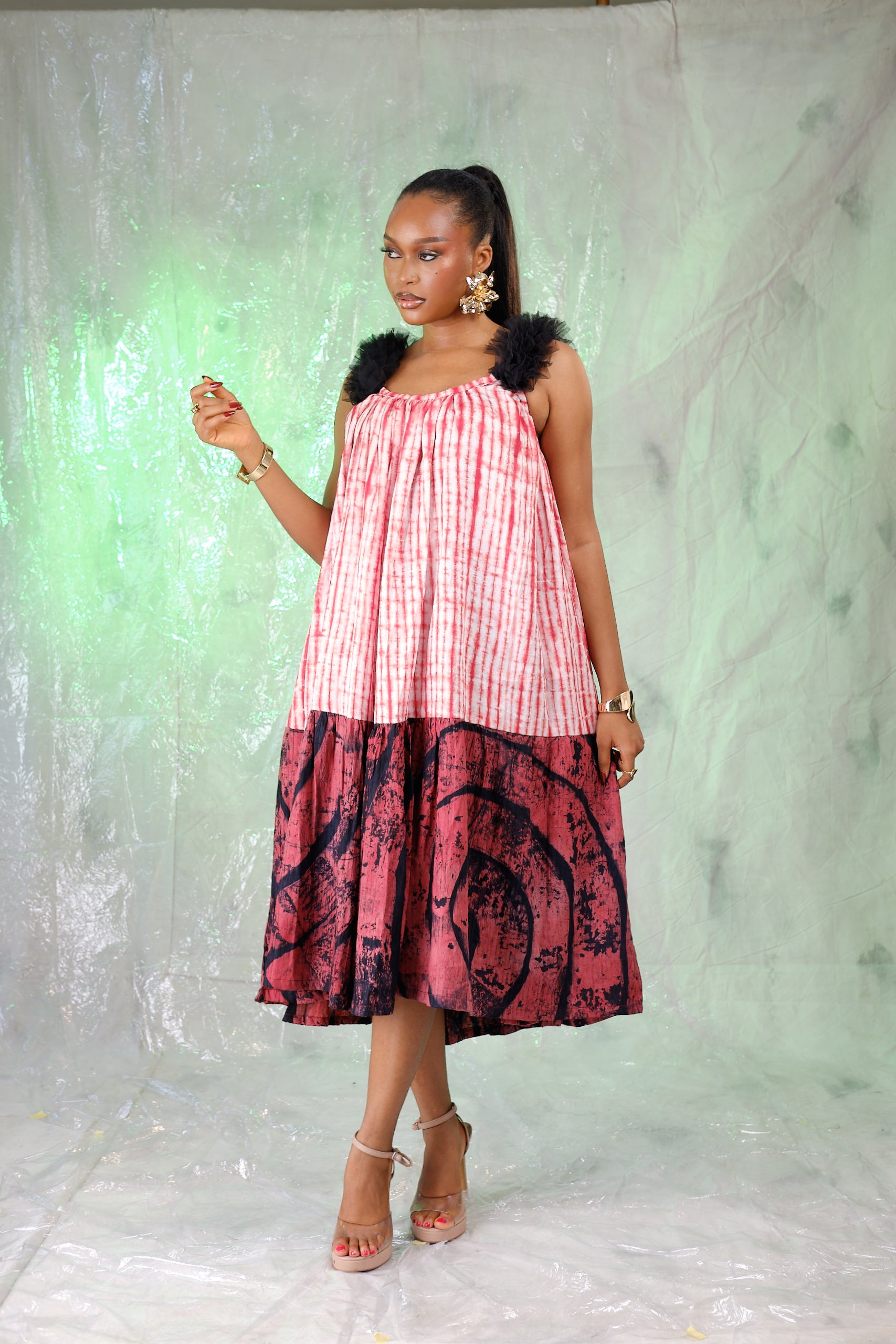 This loose-fit Adire dress is designed for effortless style and all-day comfort, making it perfect for workdays, casual outings, or relaxed weekends. Its flowy silhouette and thoughtful print pairing create a look that feels easy yet intentionally styled.