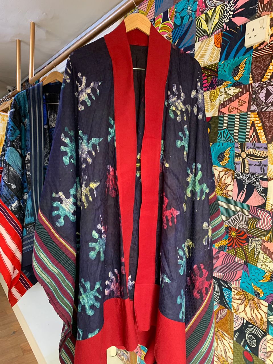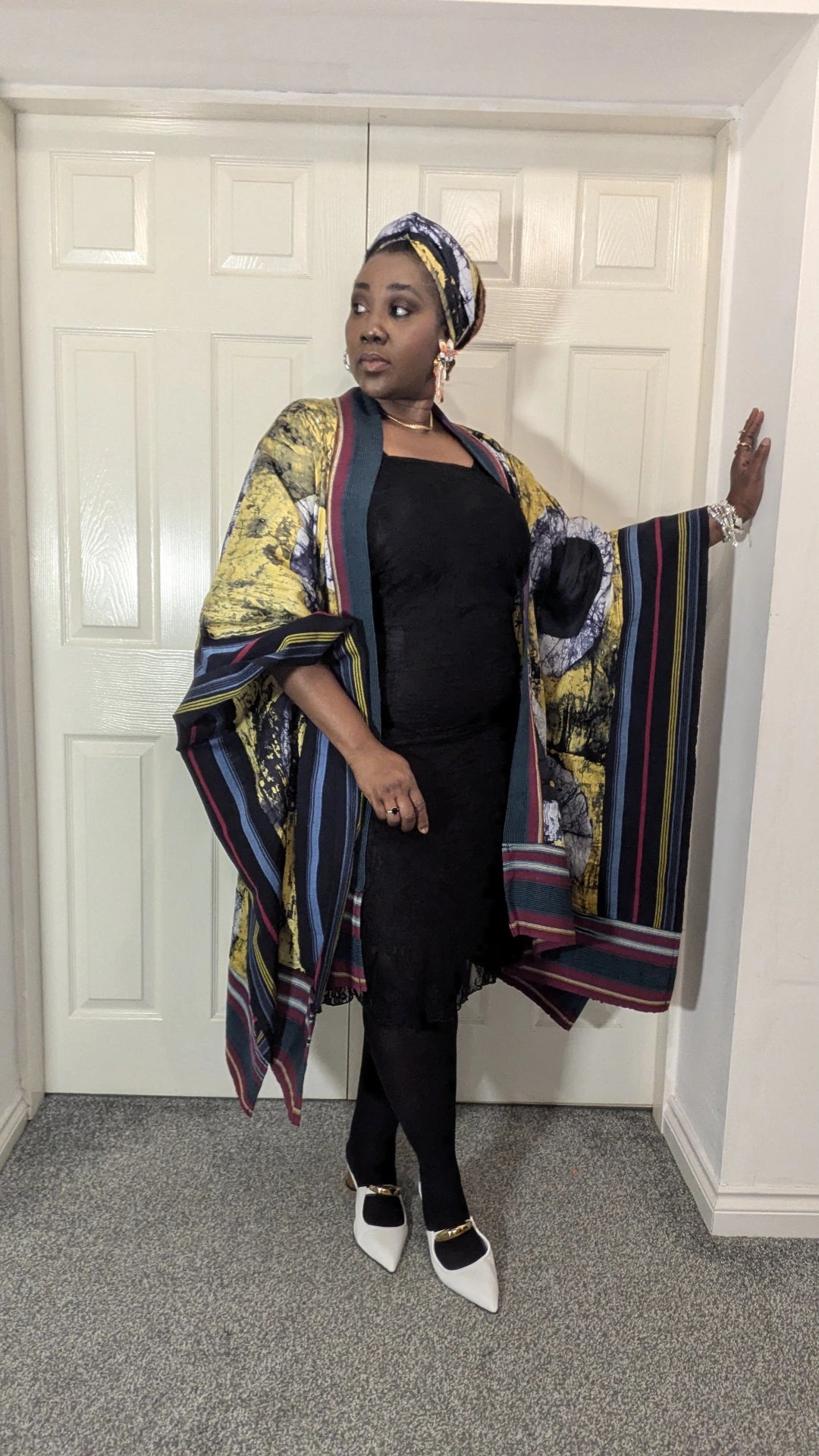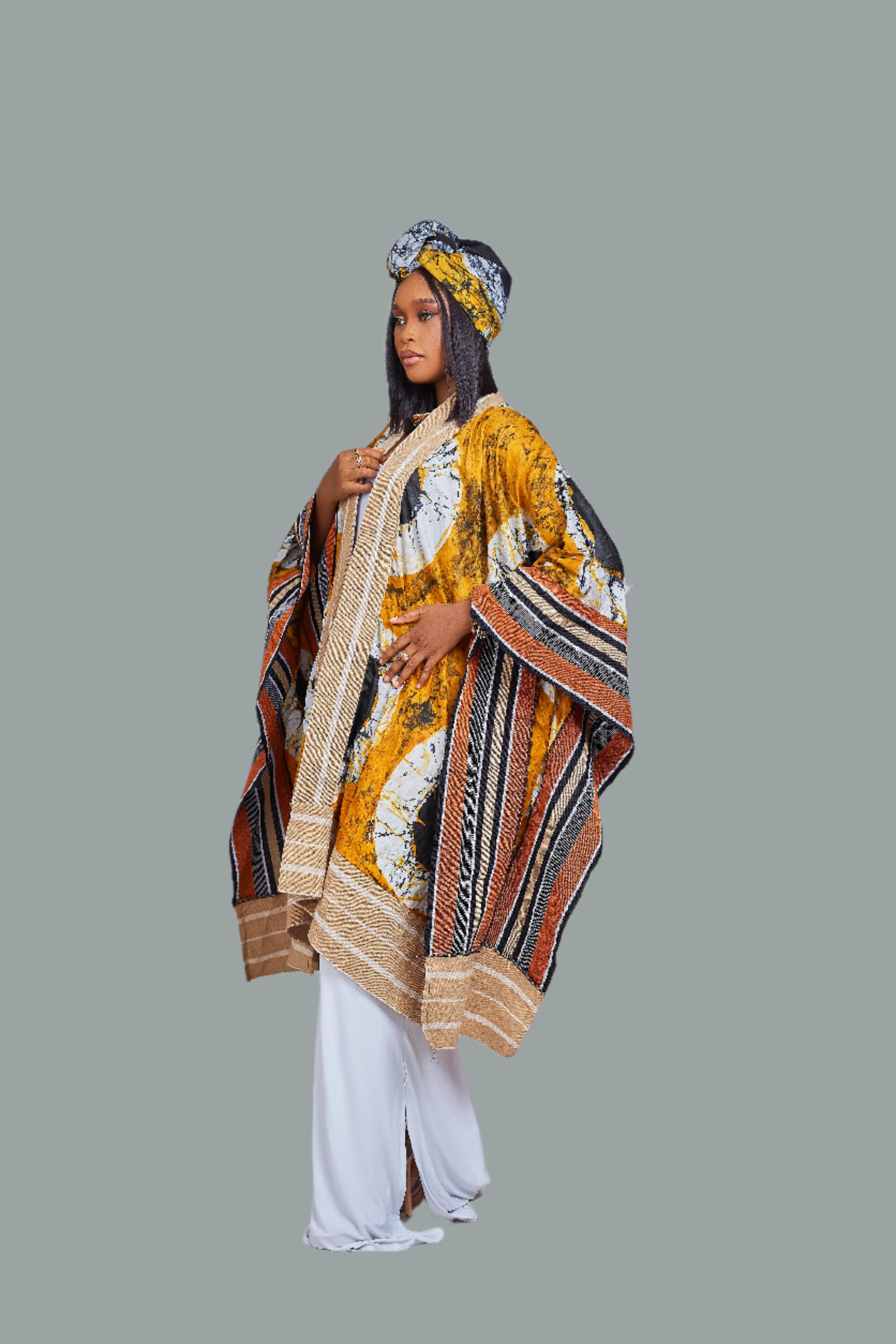 Enhance your wardrobe with our Araoluwapo aso oke cape, handwoven with exquisite aso oke fabric and adire. This one-size-fits-all cape is perfect for adding a regal and elegant touch to any outfit. Upgrade your style with this unique and timeless piece.